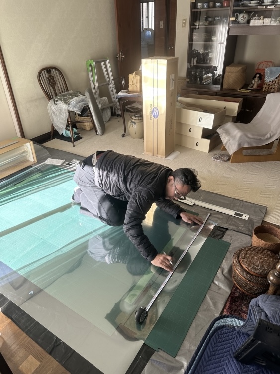 まずは窓ガラスの寸法に合わせて フィルムの切り出しから |