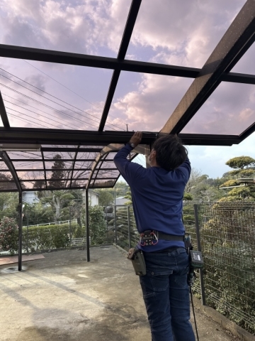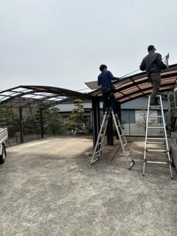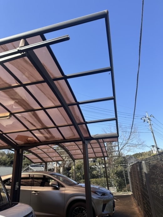 | 強風により剥がれてしまったカーポートの屋根材部分交換も可能なのですが、設置してから20年以上たつので全て交換することになりました。 | ||||||||||||